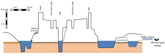 L’aigua ha adquirit una importància creixent en la interpretació de la fortificació. El descobriment del caràcter inundable del sistema de fossats i de les complexes estructures hidràuliques que n’asseguren la gestió i en reforcen la defensa, a l’hora que magnifiquen l’arquitectura del poder; la correcta interpretació del pou central –fins fa poc descrit com a cisterna–; i la repercussió de tot plegat sobre la lectura de la fortificació en termes poliorcètics expliquen la importància creixent d’aquest recurs crític.